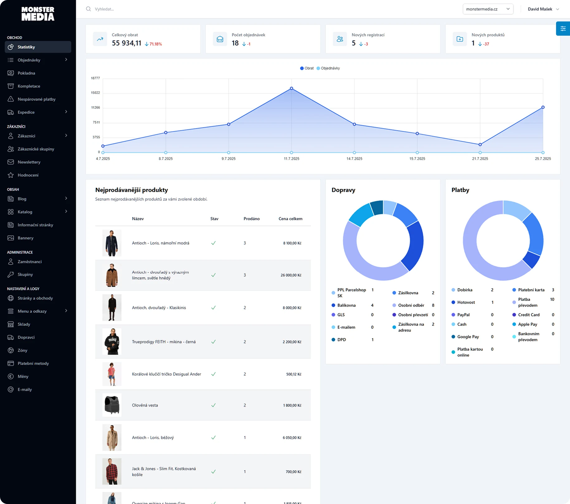 Přehledné statistiky filtrace dle data, celkové tržby, nejprodávanější produkty, dopravy, platby + další dle vašich potřeb