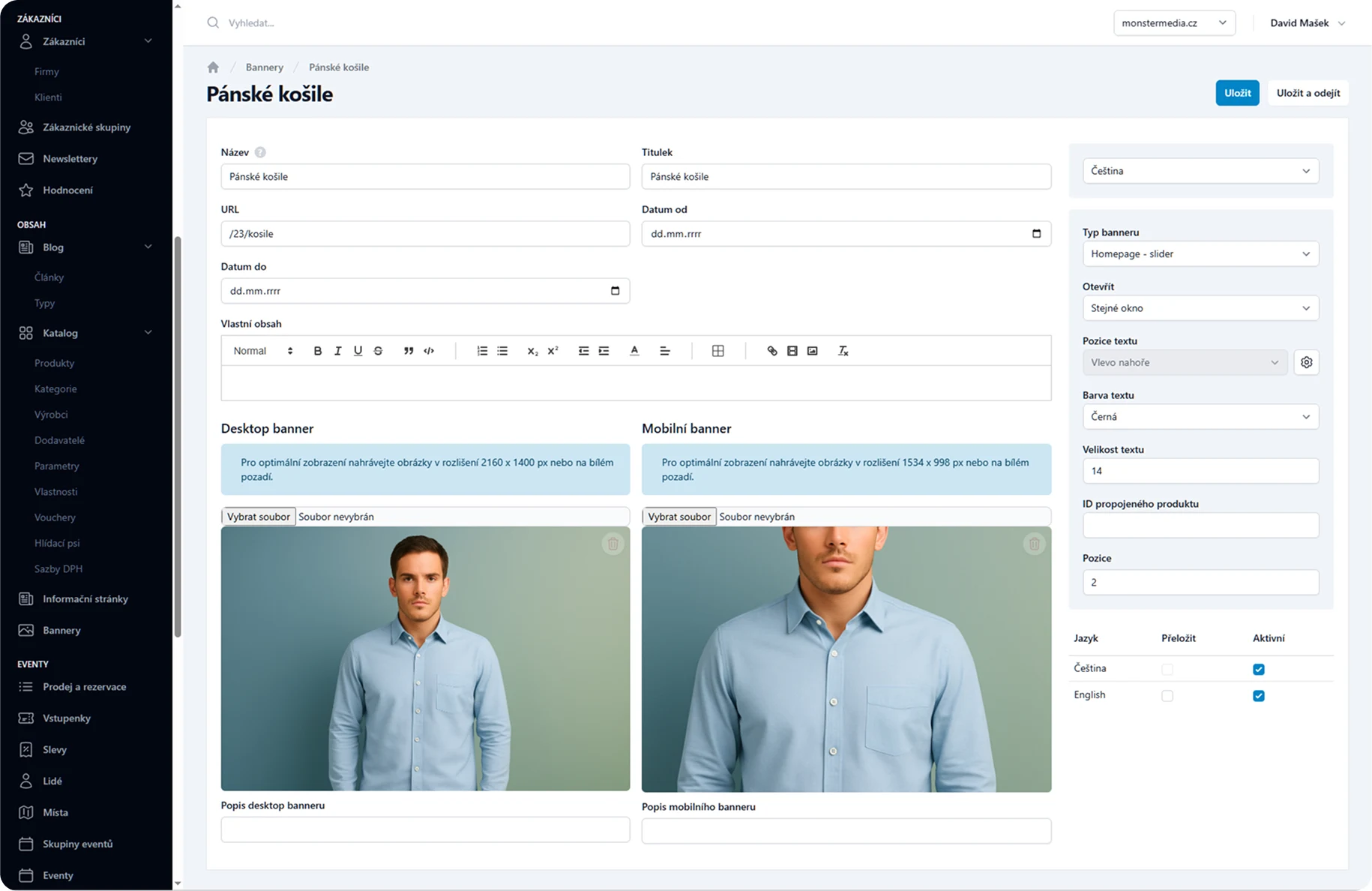Správa bannerů s možností ořezu obrázků desktop verze, mobilní verze, možnost měnit velikost a barvu písma, nastavení doby trvání banneru, ořez obrázků dle potřeb
